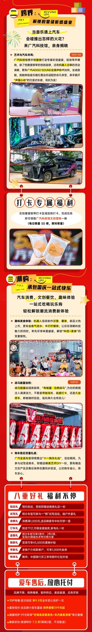 10月1日—8日下午,国风快闪、非遗咸水歌教唱、国风汉服电音秀、国潮青年唱跳秀、港风粤语电音秀、乐队国漫电音秀、民乐演出、醒狮及武术表演轮番上演,每日精彩不断档!
